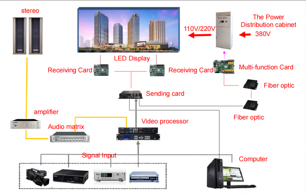 The LED display screen is essentially composed of six major parts: module boxes, control systems, power distribution systems, steel structures, fiber optics (network cables), and computer hosts.